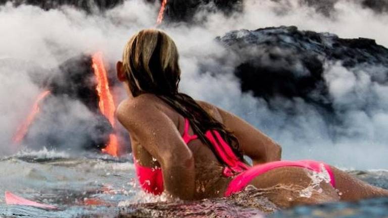 Alison Teal se atrevió a surfear cerca de un volcán en erupción. Esta estadounidense de 31 años aprovechó la erupción del volcán Kilauea.