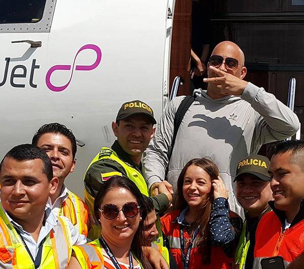 Al bajarse del avión, Diesel les habló a quienes lo esperaban en el aeropuerto: "Increíble, te amo Colombia, te amo Colombia… bonita", dijo el actor, quien posó en varias fotografías con los empleados de la terminal aérea.