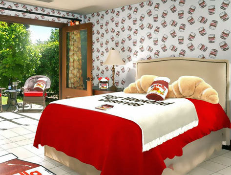 Las cortinas, los cojines, los muebles y las paredes están decorados con telas y papel que reproducen los frascos de la crema de avellana por todas partes. Los frascos reales no faltan en cada cajón del hostal.