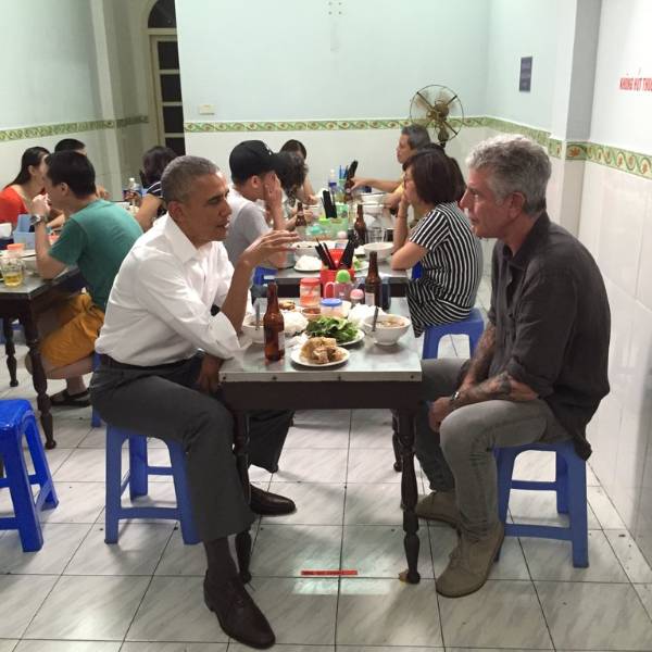 "El presidente maneja los palillos", comentó Bourdain en las redes sociales acompañando una foto de Obama delante de su tazón de bun cha, sopa a base de cerdo que seguramente no le haría mucha gracia a Michelle Obama, adepta de la alimentación sana.