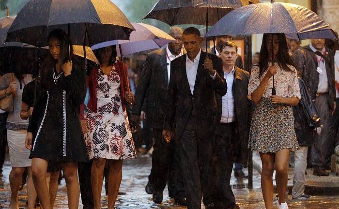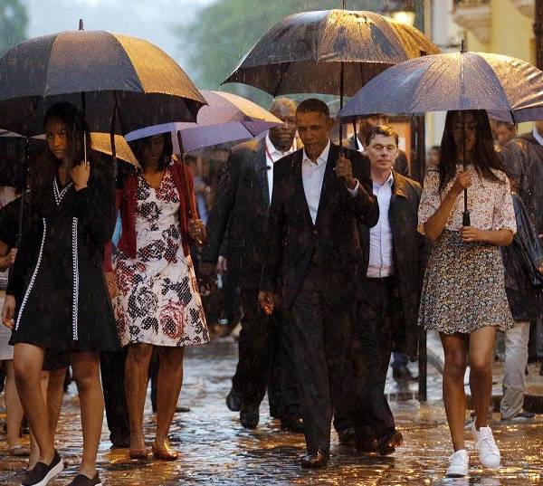 Otra de las fotos muestra a Obama sosteniendo un paraguas durante el fuerte aguacero caído el domingo en la capital cubana mientras saluda sonriente a varias mujeres en una de las calles de La Habana vieja.