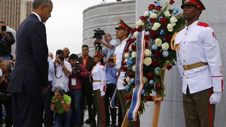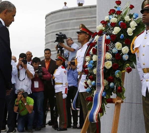 Antes de que una guardia de honor depositara la corona de flores a los pies de la escultura de mármol, se vio ondear la bandera y se escuchó el himno de Estados Unidos en la Plaza de la Revolución, donde se pudo ver a Obama con la icónica efigie del revolucionario Ernesto "Che" Guevara de fondo.