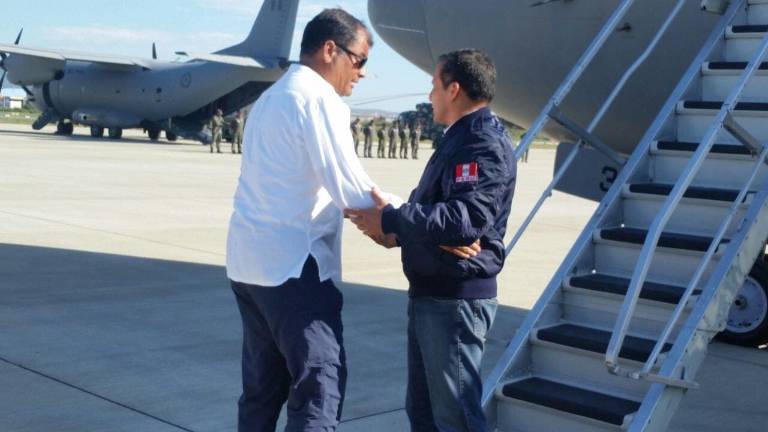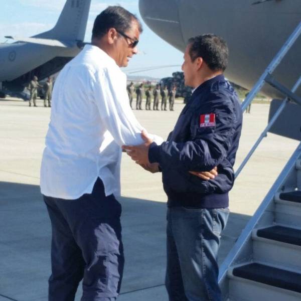 Humala fue recibido por el mandatario Rafael Correa en la base aérea de Manta. Luego, ambos recorrieron las zonas afectadas tras el sismo.
