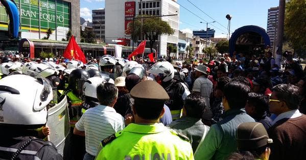 En Quito, manifestantes que acompañaban la marcha de pueblos indígenas y organizaciones sindicales, se enfrentaron a policías con el fin de romper el cerco de seguridad que se implantó para proteger la sede del Gobierno nacional.