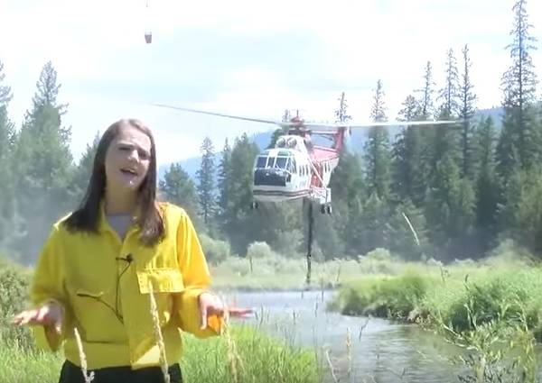 Una periodista pasó un leve susto cuando cubría los trabajos que realizaba un grupo de helicópteros que luchaba contra un incendio forestal. Al pasar por encima la aeronave, el fuerte viento de las hélices le estropearon el peinado y la obligaron a cambiar de lugar.