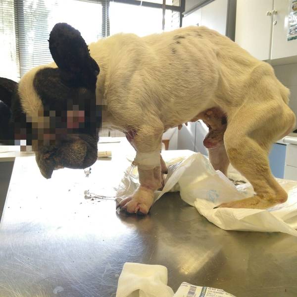Un hombre dio la alerta a la asociación SOS Frenchie al ver a un perro tirado en una caja de cartón junto a un contenedor de basura. Tenía varias prendas de ropa y una toalla encima y estaba tan mal que temía que muriera.