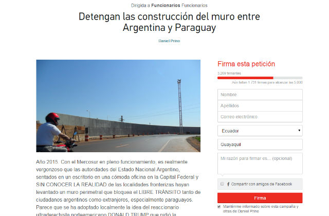 Una petición en la web Change.org acumula algo más de 3.000 firmas para exigir que se detenga la construcción del muro, una obra vinculada a la hidroeléctrica Yacyreta, que ambos países comparten en la frontera, y que rodea ahora las sedes argentinas de Aduanas, Migraciones y Gendarmería.