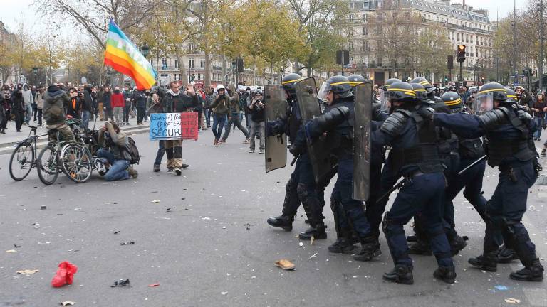 Unidades antidisturbios de la policía francesa han dispersado con gases lacrimógenos y cargas una protesta en la plaza de la República, en el centro de París, vinculada con la cumbre del clima (COP21) que comienza mañana.