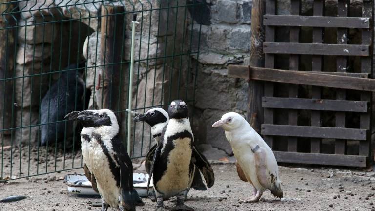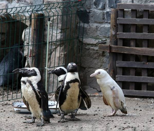 Un pingüino de El Cabo (Spheniscus demersus) albino, un caso rarísimo en esta especie sudafricana en peligro de extinción, fue presentado este viernes por primera vez en el parque zoológico de Gdansk, en el norte de Polonia.
