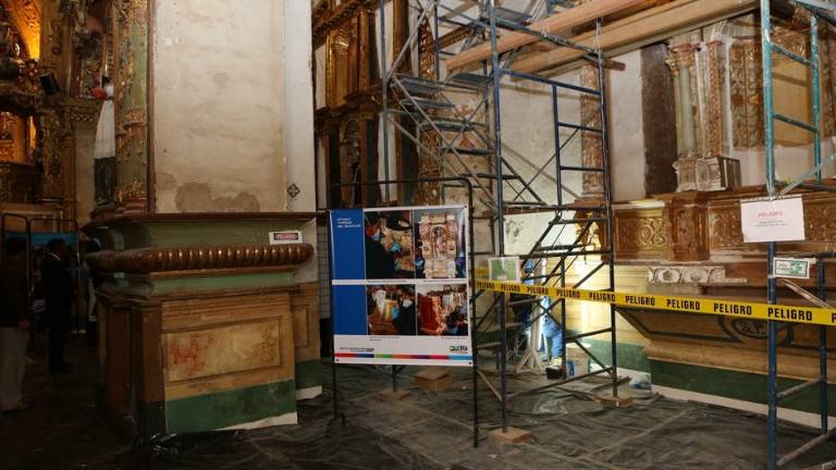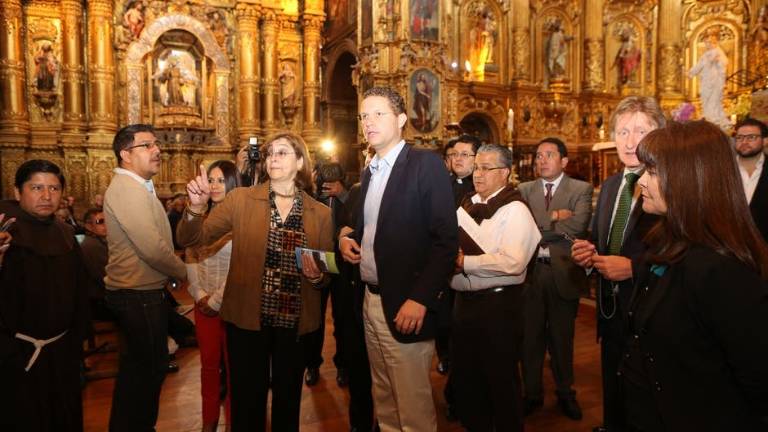 alcalde de Quito, Mauricio Rodas, visitó este viernes la iglesia de San Francisco, donde el papa mantendrá un encuentro con representantes de la sociedad civil el 7 de julio, y presenció la evolución de los trabajos de restauración y conservación que se llevan a cabo en el templo en cuadros, retablos y otros elementos históricos.