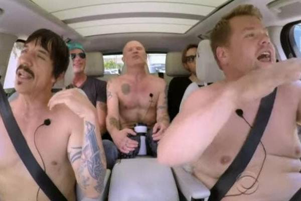 El líder del grupo, Anthony Kiedis, el bajista, Flea, el baterista, Chad Smith, y el guitarrista, Josh Klinghoffer, se unieron a Corden en un entretenido viaje en automóvil en el que interpretaron éxitos como"Can't Stop", "Give It Away", "Californication", "Under the Bridge" y"By the Way".