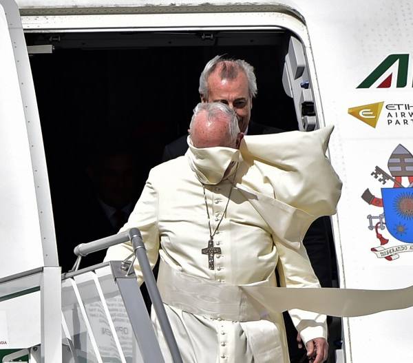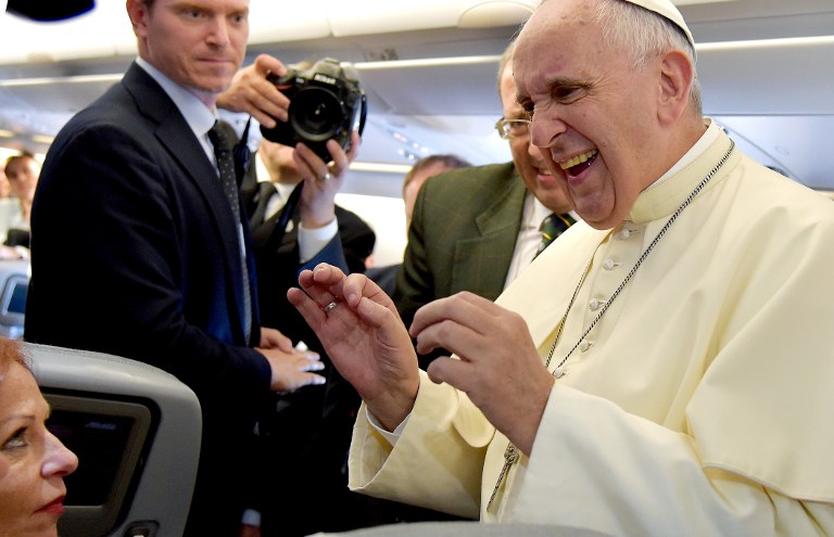 A bordo del avión papal.- En los estrechos pasillos del avión de la compañía Alitalia que le lleva a Ecuador, el papa Francisco volvió a mostrar su carácter cercano y con los periodistas que le acompañan bromeó, recibió decenas de regalos, bendijo fotos y objetos y tuvo una frase para cada uno de ellos.