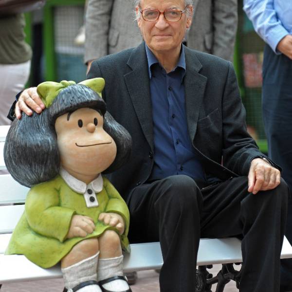 "A mí, eso me sirvió luego para convertir a los políticos españoles en personajes de Mafalda", explicaba entre risas mientras mezclando los rasgos de Susanita y Manolito hacía un retrato del Manuel Fraga, difunto fundador del conservador Partido Popular, que gobierna en España.