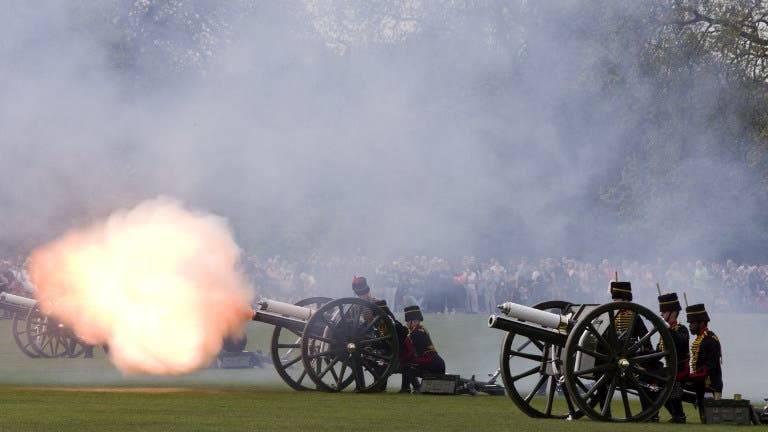 Las Tropas del Rey de la Real artillería montada dispararon 41 cañonazos en el céntrico parque londinense, al mismo tiempo que la Honorable compañía de artillería disparó otros 62 desde la Torre de Londres, con 21 cañonazos adicionales en nombre de la "City", el centro financiero de la ciudad.