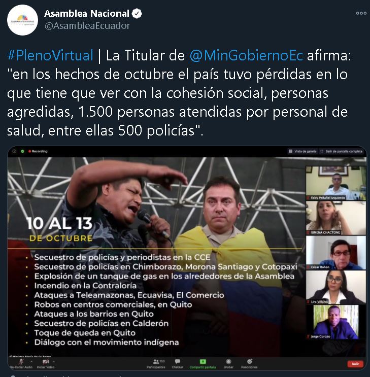 El juicio político contra la ministra de Gobierno, María Paula Romo, a quien acusan de incumplimiento de funciones durante los disturbios de octubre de 2019, se desarrolla de forma virtual, con la presencia física de la funcionaria en el palacio de Carondelet, sede del Ejecutivo, desde donde ha defendido sus decisiones durante las manifestaciones.