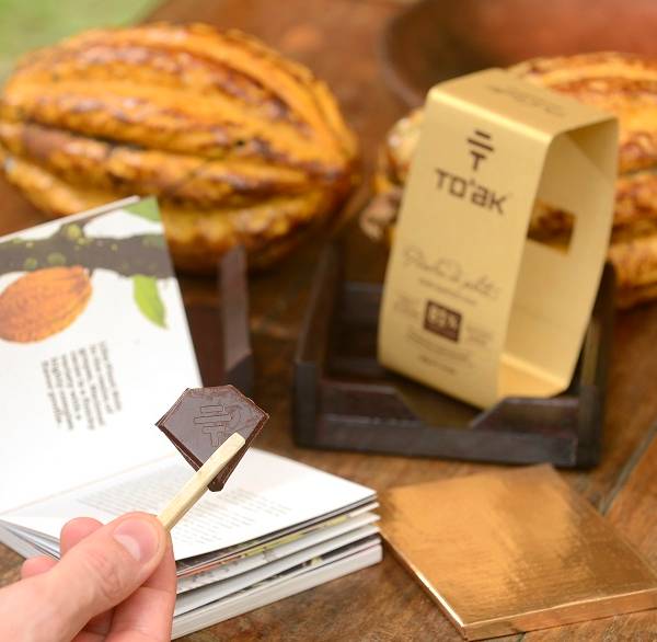 La barra de To’ak viene en una caja de laurel (madera que se usa para fermentar el cacao), que proviene de un proyecto de reforestación; allí va un libro que cuenta sobre el proyecto, los detalles de la producción, la historia del cacao, y una guía de catación del chocolate. Y agregaron una pinza de madera como herramienta para comer el chocolate. “Jerry creyó que esto aislaba el olor de las manos o del papel, y así los aromas se perciben mejor”.