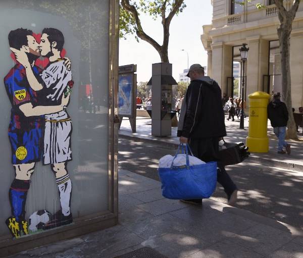 Un grafiti del argentino Lionel Messi de puntillas besando al portugués Cristiano Ronaldo está causando sensación en Barcelona a dos días de que FC Barcelona y Real Madrid se enfrenten en un partido crucial para la Liga española.