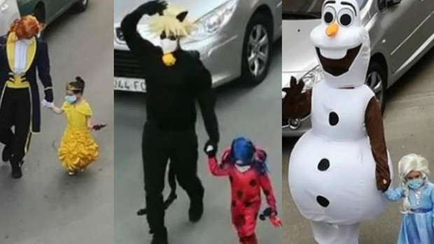 Los vecinos esperan cada tarde a esta simpática pareja para saber cuál es el disfraz que habrán elegido para caminar hasta el contenedor, alegrando con su idea los largos días de confinamiento.