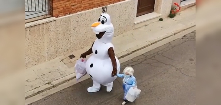 Para que la pequeña se divierta y no se afecte emocionalmente por el encierro, cada tarde a la misma hora, Jaime Coronel y Mara, de 3 años, bajan a tirar la basura vestidos de una forma distinta.