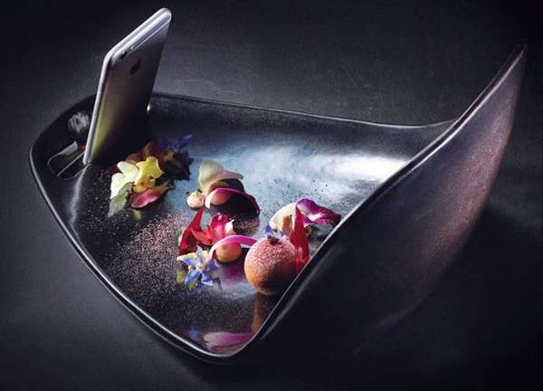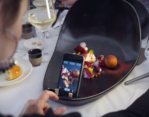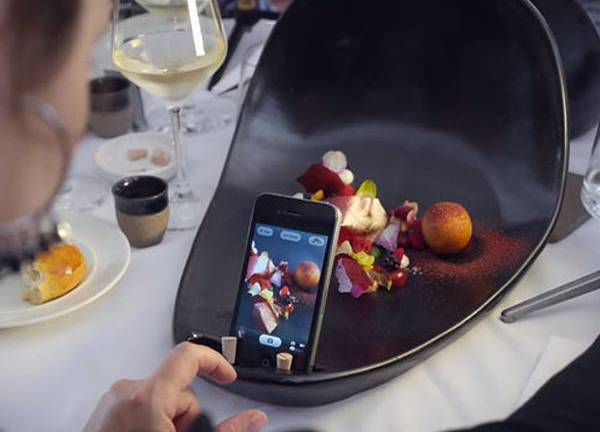 Los alimentos son servidos en platos con ranuras y soportes especiales que sirven de trípode para los smartphones.