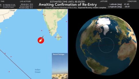 "Según la supervisión y el análisis, a las 10H24 (02H24 GMT) del 9 de mayo de 2021 la primera etapa del cohete portador Larga Marcha 5B ha vuelto a entrar en la atmósfera", informó la Agencia Espacial de vuelos tripulados de China en un comunicado, proporcionando las coordenadas de un punto situado en el Océano Índico cerca de las Maldivas.