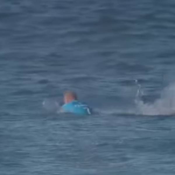 Fanning, de 34 años, está sentado en su tabla esperando las olas cuando nota un impacto. Inmediatamente se gira y comienza a remar, consiguiendo escapar del ataque. Momentos después es remolcado por una moto acuática de la organización.