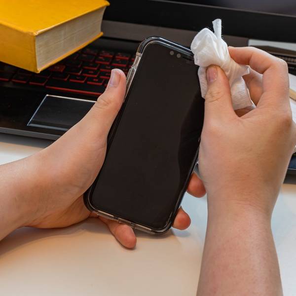 Use toallitas impregnadas en alcohol isopropílico al 70% o toallitas desinfectantes por las superficies duras y no porosas del smartphone (pantalla, teclado). El truco es dejar que el alcohol se evapore.