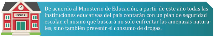 De acuerdo al Plan Institucional de Emergencias para Centros Educativos elaborado por la Secretaría Nacional de Riesgos y el Ministerio de Educación (ME), estos establecimientos deben informarse y conocer de antemano el mapa de riesgos a los que están expuestos, así como contemplar rutas de evacuación, señalización, equipos de emergencia y personal preparado para afrontar a algún tipo de inconveniente.