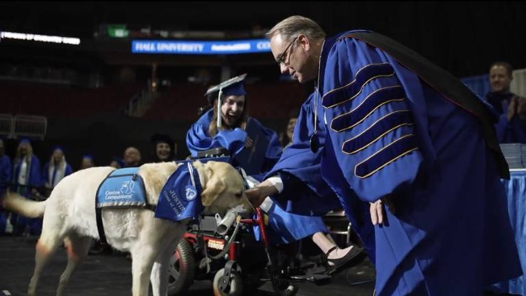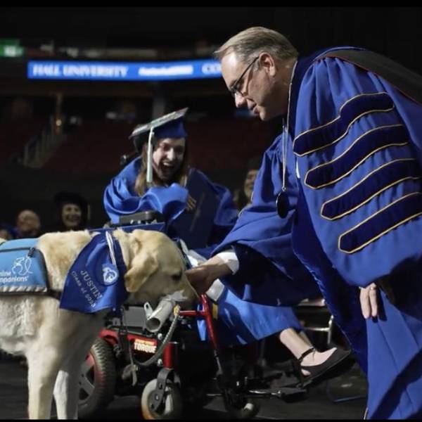 Justin, un perro de seis años de edad, es una mezcla de labrador y Golden retriever que ha sido el compañero perfecto para Grace Mariani, una estudiante con discapacidad que logró su título de licenciada en Ciencias en Educación.