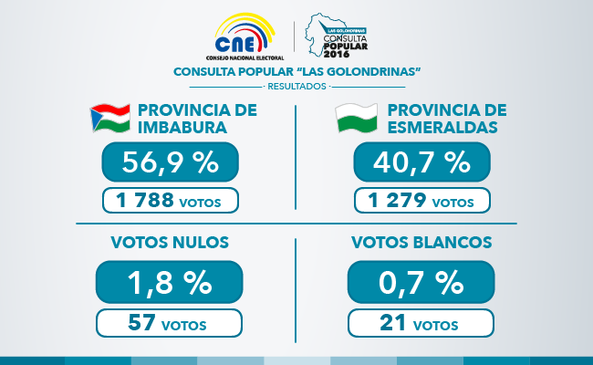De acuerdo a los resultaron preliminares, los habitantes de “Las Golondrinas” eligieron adherirse a Imbabura con un 56,9% (1.788) de los votos por sobre un 40,7% (1.279) de la opción de pertenecer a la provincia de Esmeraldas.