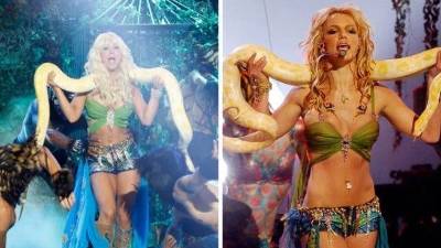 La actriz de The Big Bang Theory, donde encarna a Penny, vistió la misma ropa que usó la cantante en el videoclip 2001, incluso se puso un pitón sobre el cuello como Spears en el pasado.
