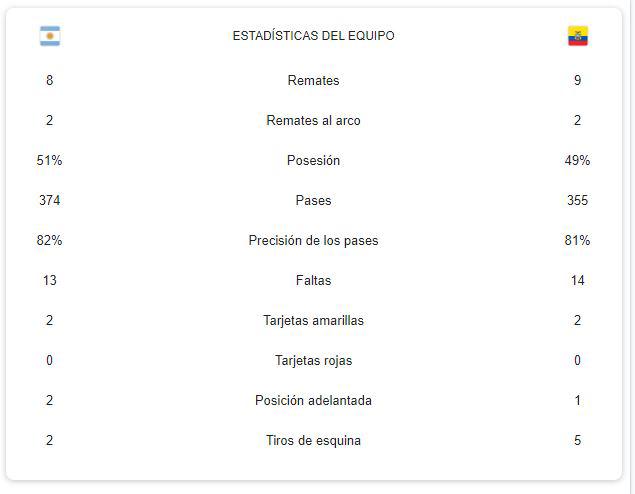 Argentina, actual campeona del mundo, se adelantó en el minuto 36 con un gol de cabeza del central Lisandro Martínez. En cambio, en el minuto 61, el capitán de la Tri, Enner Valencia, erró un penalti y la oportunidad para igualar el marcador.