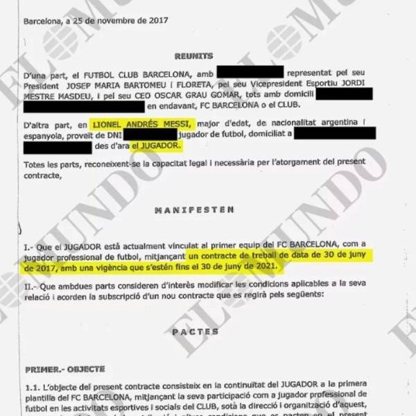 Se trata del documento que vence este 30 de junio próximo, rubricado el 25 de noviembre de 2017 cuando Josep María Bartomeu era el presidente, que le garantizó ingresos superiores a los 555 millones de euros, unos 670 millones de dólares.