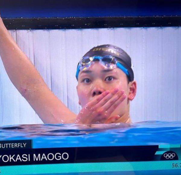 En la instantánea se observa a una nadadora de Japón con el rostro sorprendido y en el rótulo de la transmisión televisiva se lee que supuestamente la deportista se llama ‘Yokassi Maogo’.
