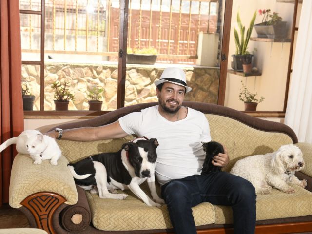 Iván junto a sus mascotas rescatadas. Foto: César Mera.