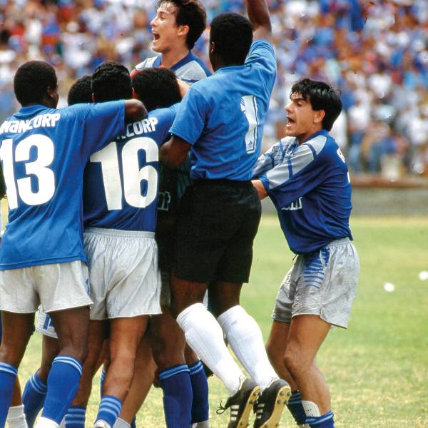 El arquero Javier Baldriz festeja con sus compañeros el penal que atajó al brasileño Toninho Vieira, y que terminó en empate 1-1 ante Barcelona en el Monumental. El punto fue determinante para ganar su grupo y jugar la final ante Deportivo Quito en 1988.
