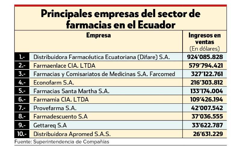A este segmento, es necesario sumar dos compañías, Distribuidora Farmacéutica Ecuatoriana Difare S.A. y Farmaenlace, que constan entre las empresas distribuidoras de farmacias, en la categoría de venta de productos farmacéuticos al por mayor, las mismas que encabezan la lista de las 10 empresas del sector de farmacias más grandes del Ecuador, según la Superintendencia de Compañías.