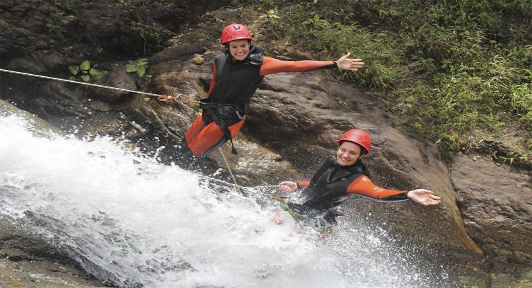 Este destino es ideal para quienes buscan aventuras al aire libre como recorridos en cascadas o baños en sus refrescantes termas. A este cantón se lo conoce como la capital de la aventura, por lo que es un buen sitio para la adrenalina y para la práctica de deportes de aventura como: cabalgata, canopy, escalada, trekking, ciclismo, parapente, rafting y canyoning. Para este último, Baños de Agua Santa tiene varios sitios para su práctica, tales como las cascadas de Chamana, Alto, San Jorge y Cashaurco, y Río Blanco.