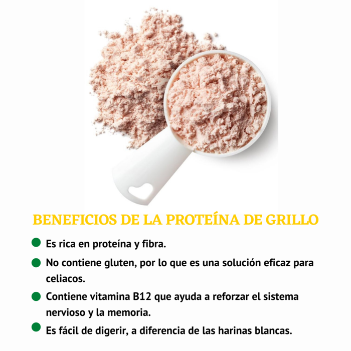 La proteína de grillo es considerada un súper alimento y cuenta con nueve aminoácidos esenciales, contiene más hierro que las espinacas, más vitamina B12 que la carne de res y más calcio que la leche. El grillo es 80% más digestivo que la carne vacuna debido a su alto índice de magnesio y calcio. Además, contiene una fibra llamada quitina, que favorece la digestión y mantiene saludable la flora intestinal.
