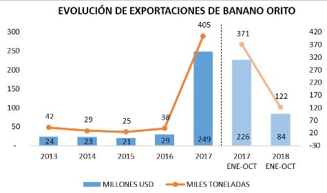 Otro producto que registra una tendencia alentadora es el guineo orito, conocido en el mercado mundial como baby banana. Hasta el 2016, las exportaciones de esta fruta solo llegaban a las 38 millones de toneladas, pero en 2017 dio un gran salto al cerrar con 405 millones de toneladas, debido a una demanda inusitada de Estados Unidos.