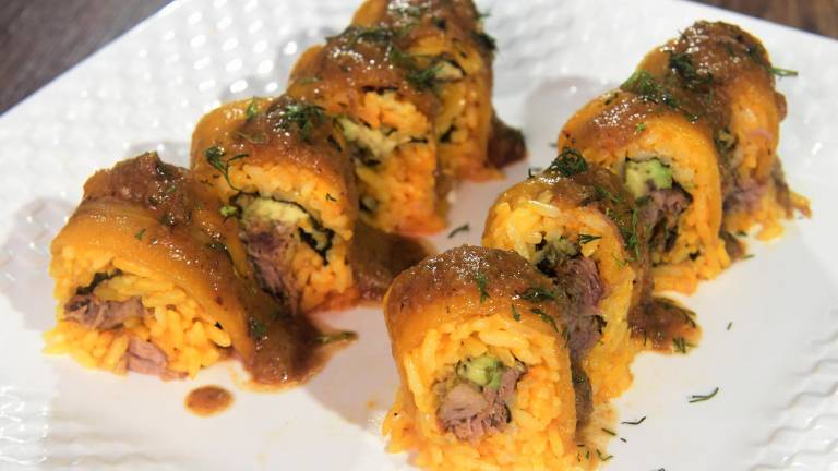 Este platillo -explica- es preparado de manera similar a un ‘roll’ de sushi, es decir a base de algas y arroz, pero éste en particular lleva carne de chivo, aguacate y queso crema envueltos en maduro frito. En su menú está también el sushi de encocado preparado con merito, el Yakimeshi Kai, que es similar a una paella de mariscos, el salmón a la plancha relleno con pulpo y bañado con salsa de maracuyá, así como platos populares como el chaulafán o el arroz con pollo.