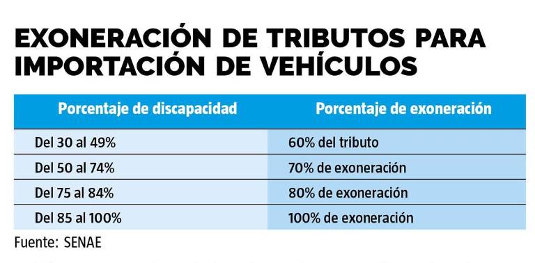 En el Ecuador las personas con un 30 a 100 por ciento de discapacidad y quienes jurídicamente están encargadas de su atención, pueden importar vehículos para su uso exclusivo con exenciones del pago de tributos al comercio exterior, de acuerdo un porcentaje equivalente a su condición.