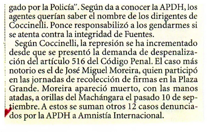 “José Miguel Moreira, quien participó en las jornadas de recolección de firmas en la Plaza Grande, apareció muerto, con las manos atadas, a orillas del Machángara el pasado 10 de septiembre”, menciona uno de los recortes de 1997, meses después de declararse inconstitucional el artículo 510.