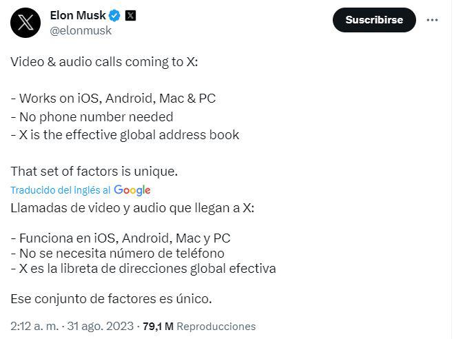 "Las llamadas de audio y video están llegando a X", escribió Musk en un mensaje en la plataforma, sin indicar cuándo estas nuevas funciones estarán disponibles.