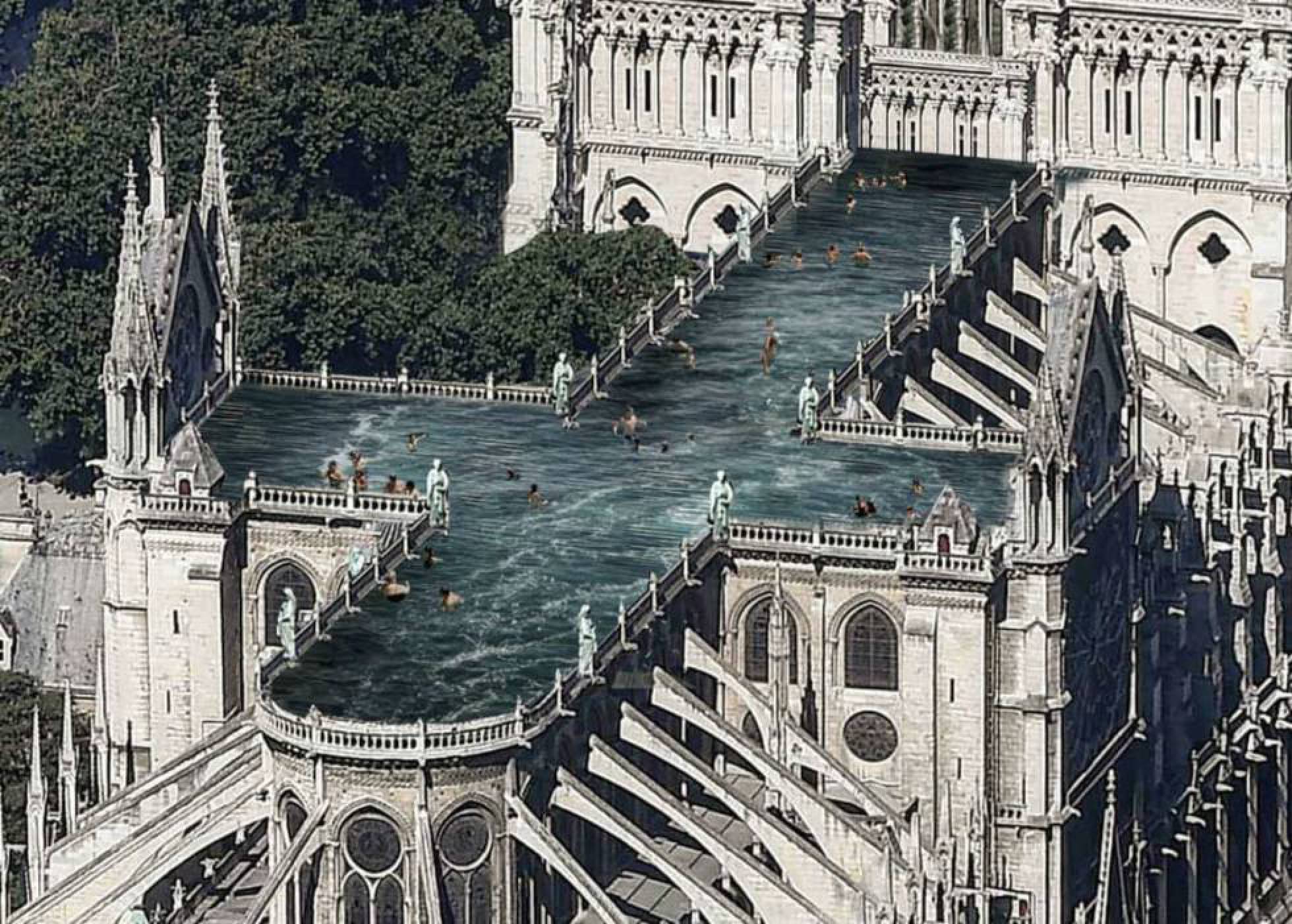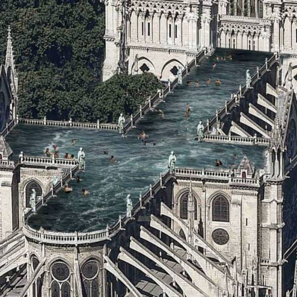Dotar a la catedral de un uso complementario al del asombroso interior ha sido la decisión del estudio sueco Ulf Mejergren Architects. Para ello, proponen esta gran piscina concebida como un nuevo espacio público para la contemplación, que invitase a la meditación y la reflexión que desencadena un espacio como el de Notre Dame.