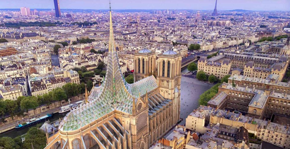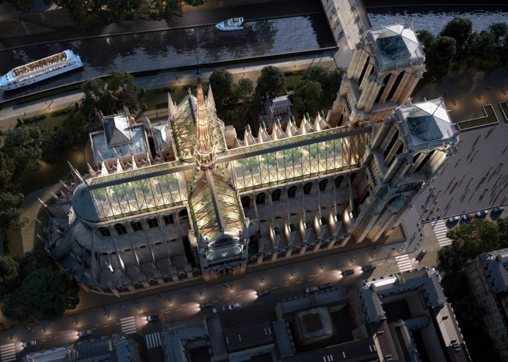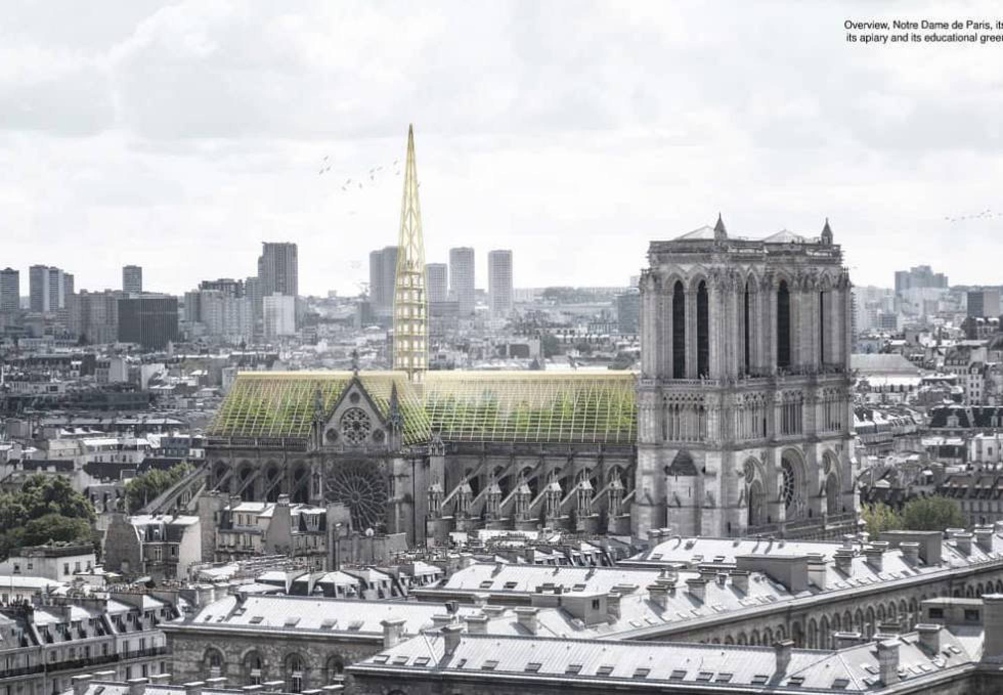 El arquitecto belga presenta la reconstrucción de la catedral como 'statement' de su arquitectura, y considera que el proyecto puede ser utilizado como estandarte de las posibilidades ecológicas de la ingeniería a través de la tecnología o con estrategias de sostenibilidad. Propone así una cubierta que generará energía y contendrá una granja hidropónica (que utiliza disoluciones minerales en lugar de suelo agrícola para poder cultivar en contenedores), convirtiendo la catedral en un edificio 'eco-friendly' que generaría más energía que la que consumiría.