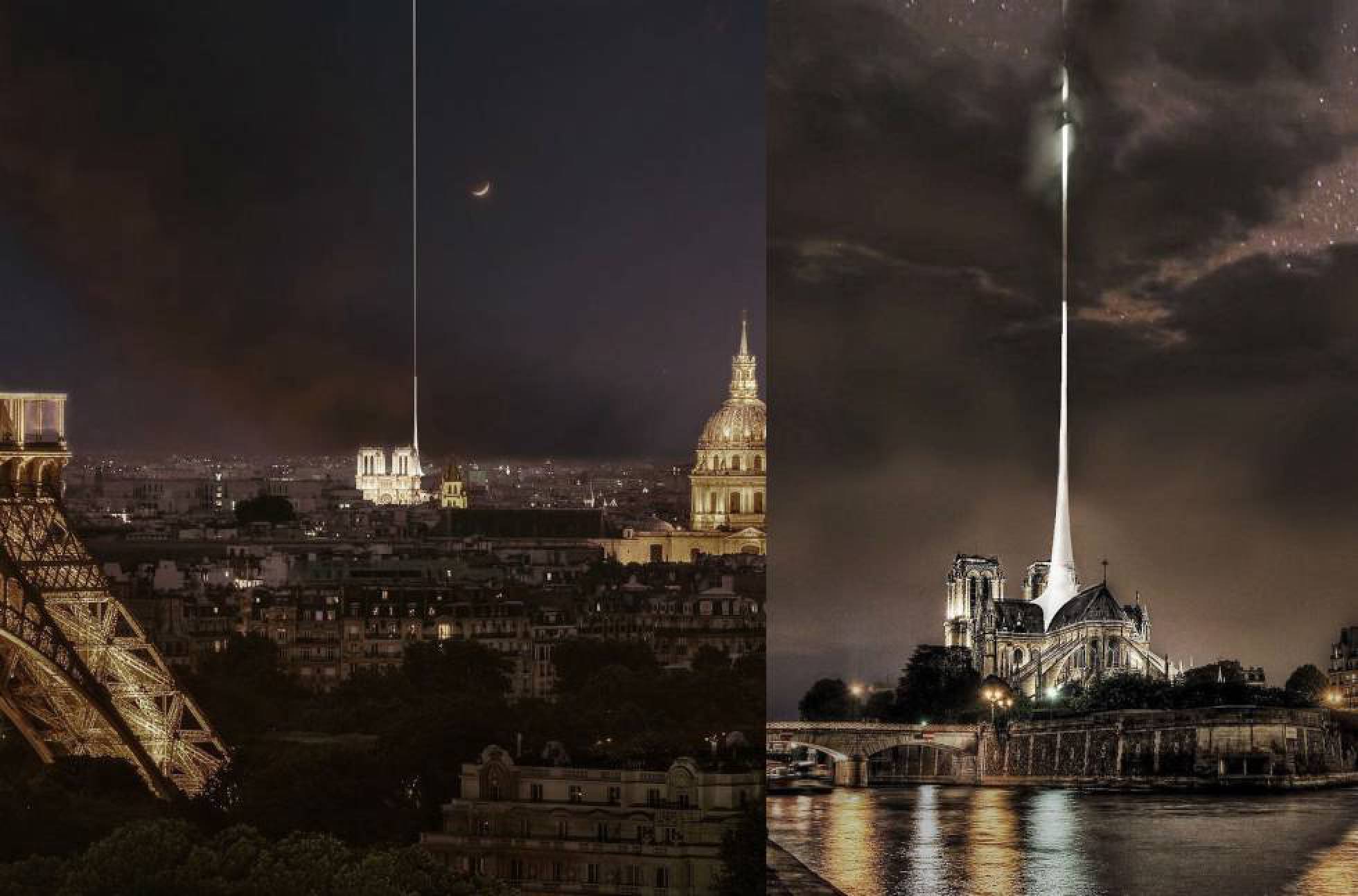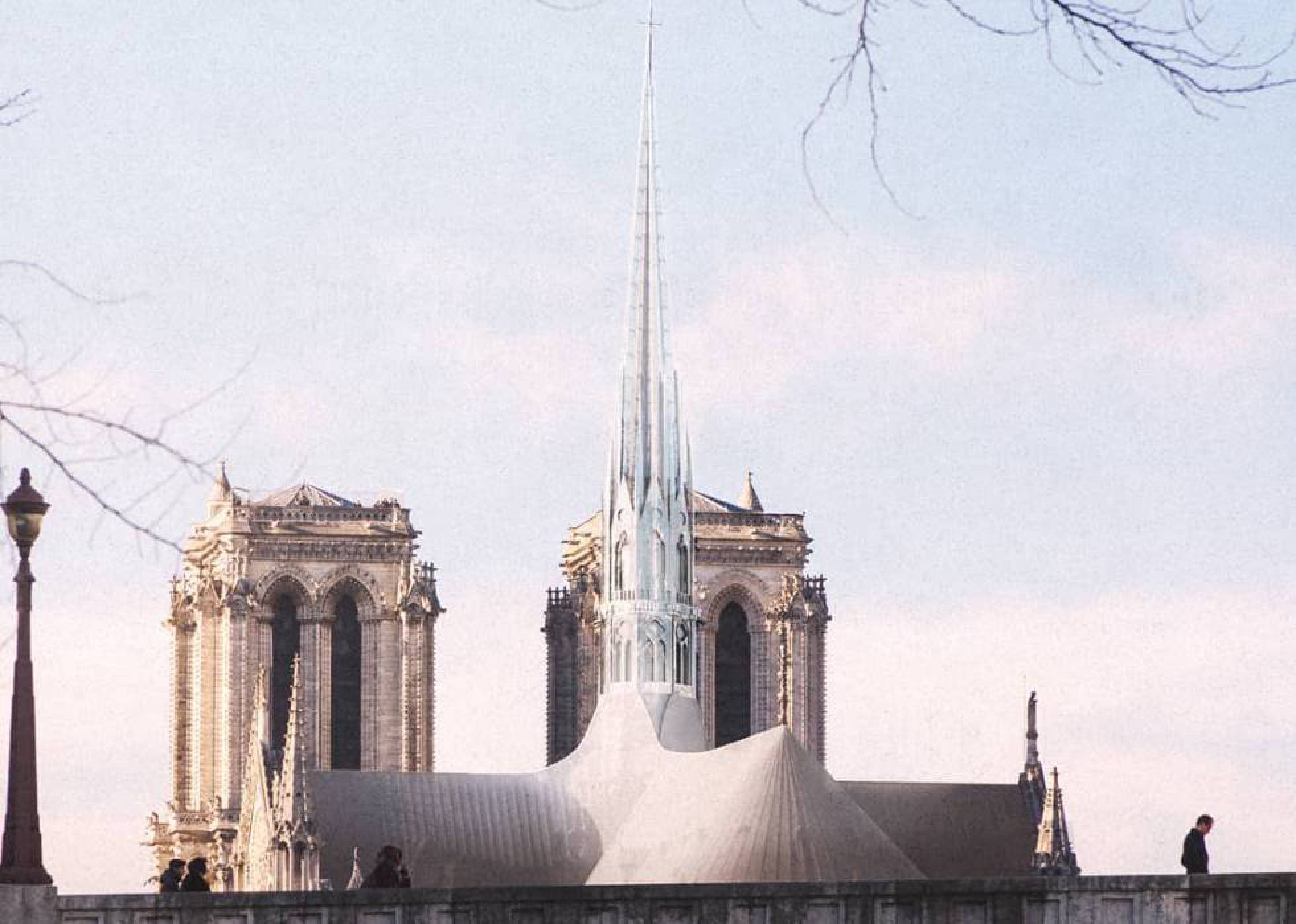 La pareja italiana que forma el estudio Fuksas Architects —Massimiliano y Doriana Fuksas— se suma a la cantidad de propuestas que se deciden por la vía del cristal, y propone la reproducción de una nueva aguja a imitación de la anterior y cubiertas en este material (en las redes sociales ya ha surgido una resistencia en contra de estas propuestas por no ser amigables con las aves). Ellos han elegido cristal de Baccarat, la región francesa próxima a Estrasburgo, y entienden este material como símbolo de la fragilidad de la historia y la espiritualidad, empleando la luz como representación de lo inmaterial, según enuncian en sus redes.