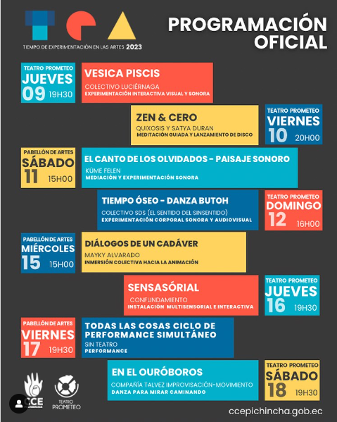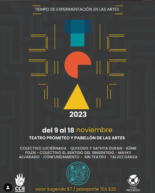 El Núcleo Pichincha de la Casa de la Cultura Ecuatoriana presenta el Festival "Tiempo de Experimentación en las Artes" (TEA) 2023, evento que se desarrollará en Quito del 9 al 18 de noviembre. Este espectáculo promueve la investigación y el cruce de lenguajes artísticos con un enfoque crítico sobre los temas de relevancia en la sociedad contemporánea.