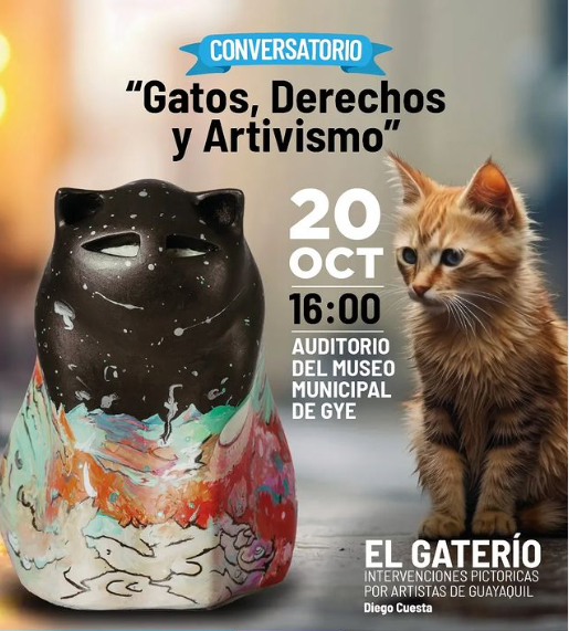 Sociedad Anómica y el Municipio de Guayaquil desarrollarán el 20 de octubre un conversatorio de "Gatos, Derechos y Artivismo" con la finalidad de que la ciudadanía conozca los problemas que encaran los animales urbanos en situación de abandono, a la par de plantear soluciones.