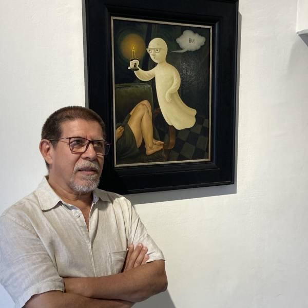 Sin querer queriendo Jorge hace carrera contando su vida con un pincel. En un rincón de la exposición un cuadro me llama la atención. Representa un fantasma asustando a una mujer que parece desmayarse. ¿Qué significa este cuadro Jorge? “En el año 2015 tuve un infarto, estuve cerca de la muerte. Antes de que me hagan el cateterismo hice el boceto del cuadro, era como verme muerto y regresar para ver a mi mujer”, contesta con una pequeña sonrisa.